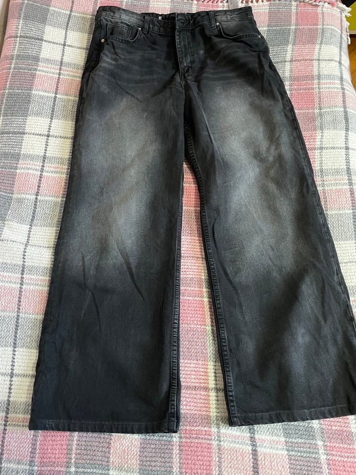 Gri, bol kesim, kemerli denim pantolon. Midi boy, sokak stili için uygun, günlük kullanımda rahat.