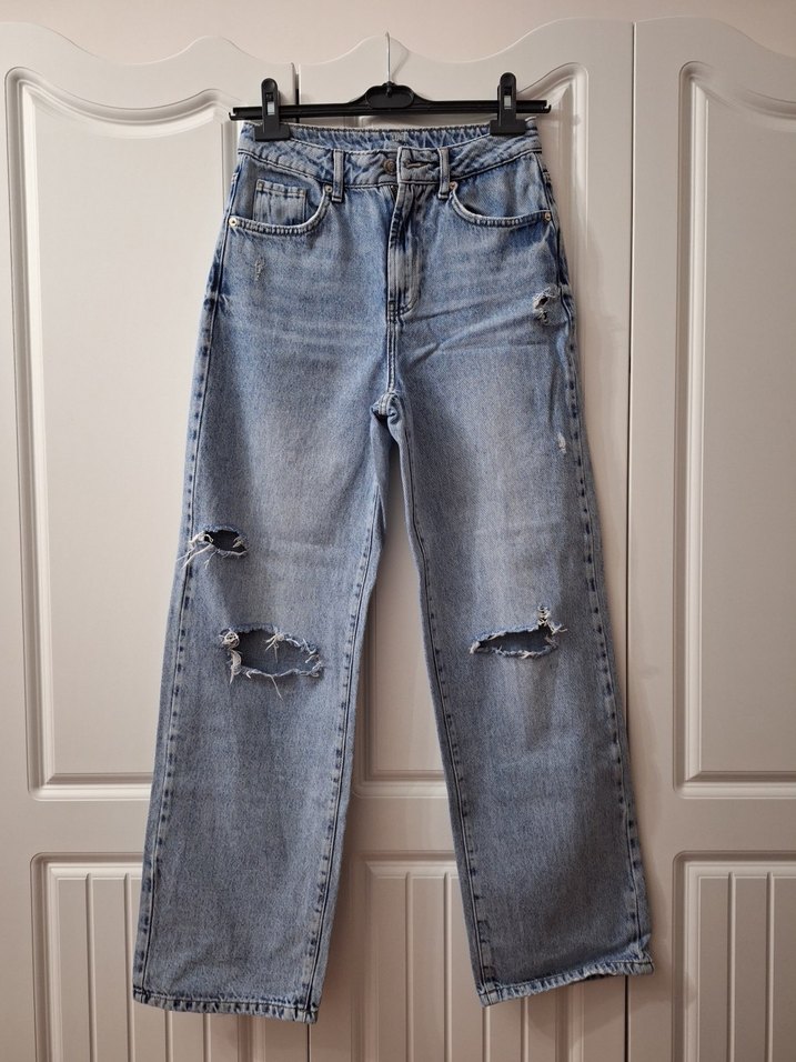 Bol kesim, kot kumaştan, kemerli ve yırtık detaylı midi uzunlukta gri kot pantolon, günlük rahat sokak stili için uygun.