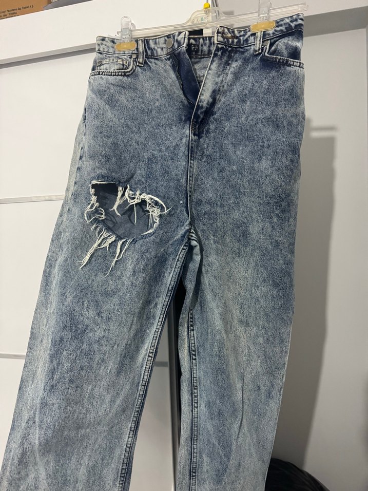 Kadınlar için gri denimden yapılmış, bol kesim ve normal boyda, yırtık detaylı, sokak stiline uygun günlük kullanıma elverişli pantolon. 38/40 beden için uygundur