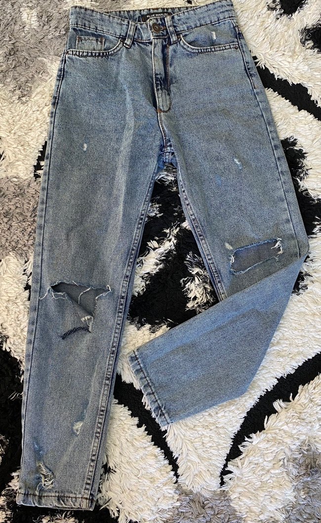 Gri renkte, bol kesim ve yırtık detaylı kadın denim pantolon, günlük rahat kullanıma uygundur.