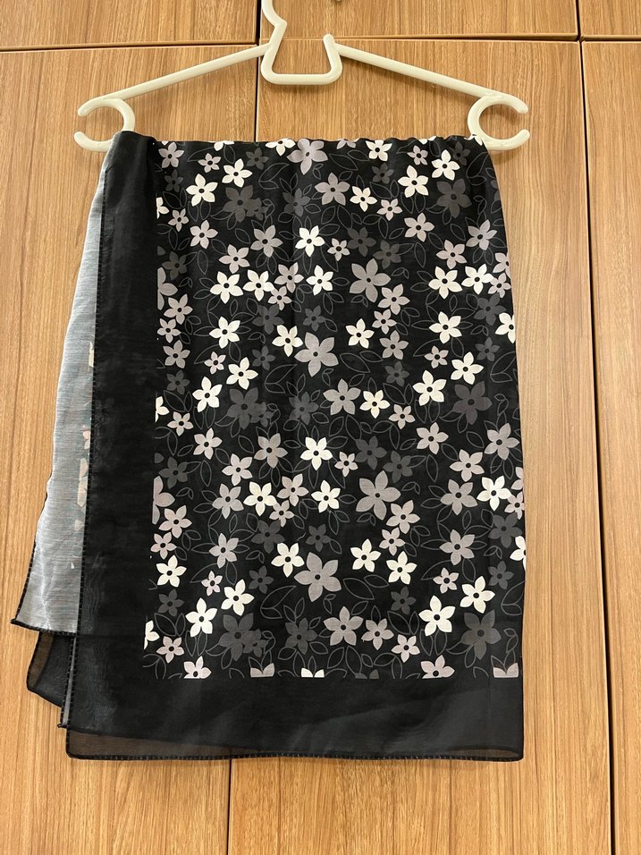 Kadınlar için tasarlanmış, sentetik kumaştan gri çiçek desenli, drapeli şal. Goth ve avant-garde tarz için uygun.