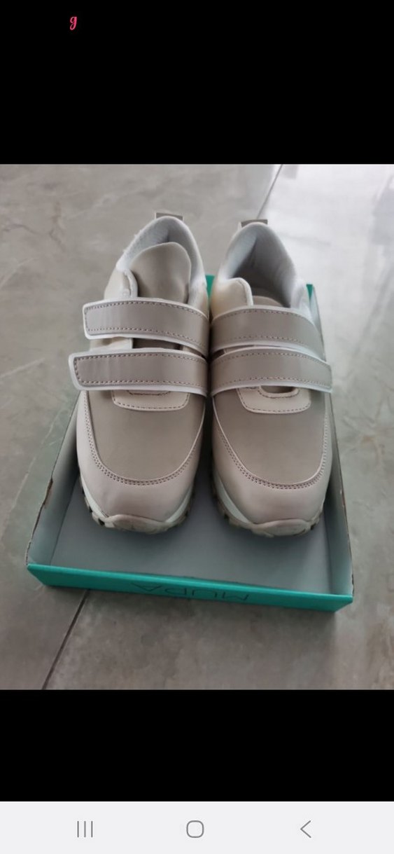 Kadın spor ayakkabılar, dolgu topuk ve cırt cırtlı bantlara sahiptir. Gri renkte, düz ve kauçuk malzemeden üretilmiştir. Günlük kullanıma uygundur.