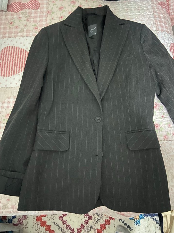 Kadın gri çizgili blazer ceket, keten kumaştan, çıtmalı ön ve normal midi boyda. Ofis kullanımı için uygundur. İç astarında yırtık mevcut