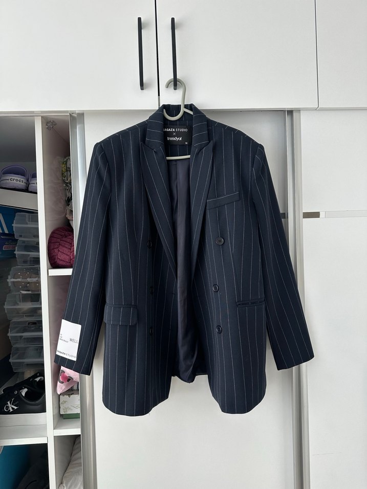 Kadın Gri Çizgili Düğmeli Blazer Ceket