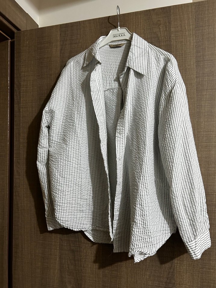 Kadınlar için uzun kollu, çıtçıtlı, keten kumaştan yapılmış gömlek. Gri çizgili ve normal boyda, rahat kesimlidir, günlük kullanıma uygundur.