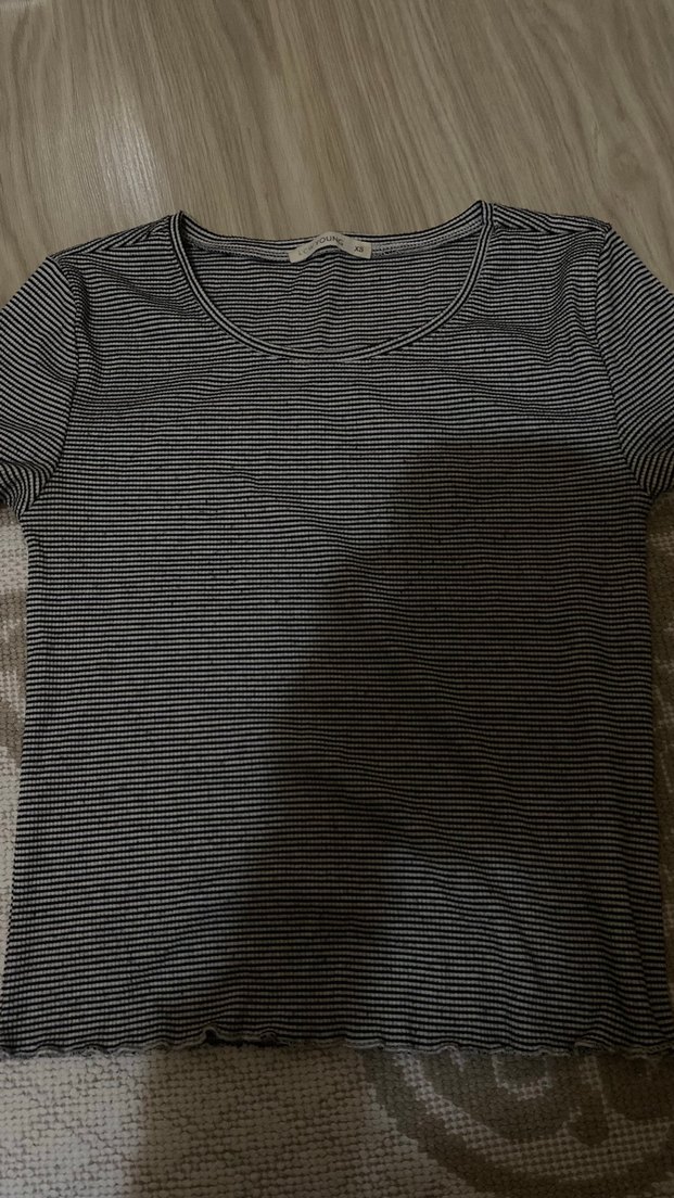 Kadınlar için kısa kollu, bisiklet yaka ve çizgili desene sahip, pamuklu kumaştan yapılmış, vücuda oturan gri tişört. Günlük kullanıma uygun, rahat ve şık bir model.