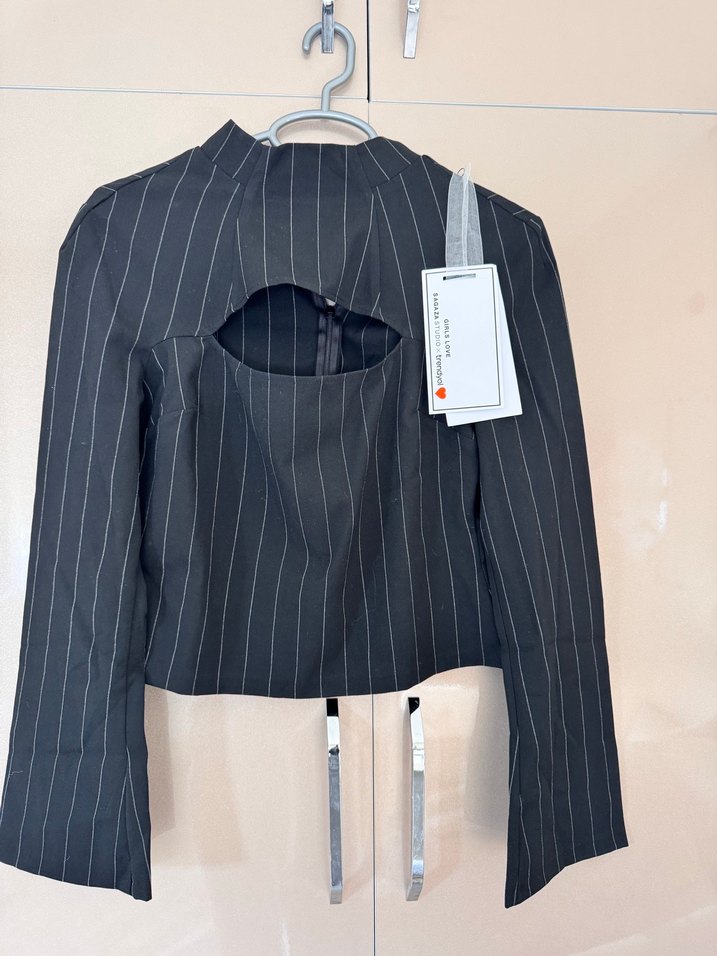Kadın gri çizgili blazer, notched yaka ve uzun kollu. Düğmeli ön kısmı, normal kesim ve midi boyuyla ofis ve sokak stiline uygun.