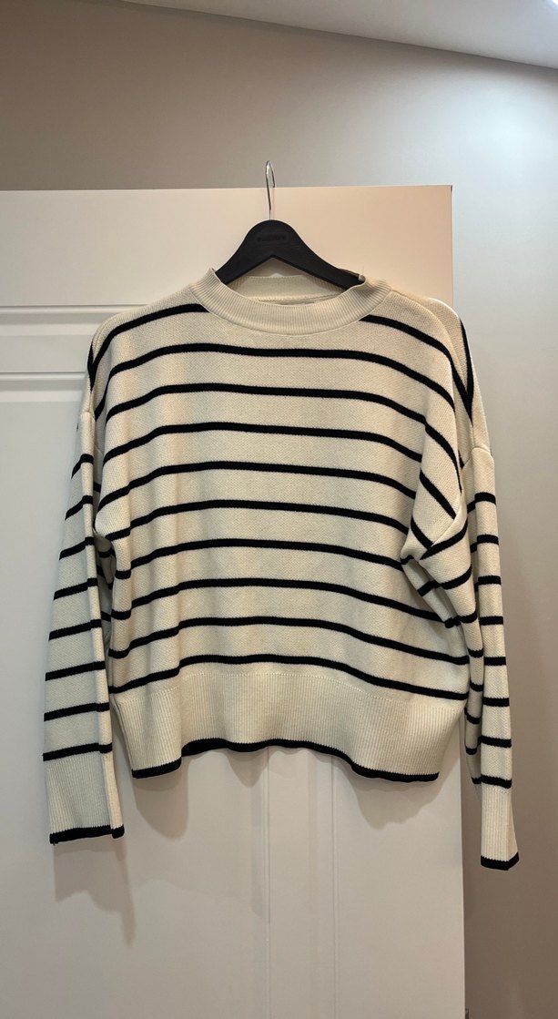 Uzun kollu, bisiklet yaka, yumuşak yünden, bol kesim kadın örgü kazak. Gri beyaz çizgili deseniyle trend sokak stiline uygun.