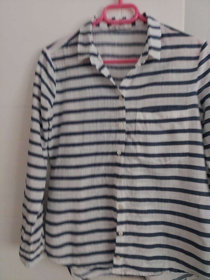 Kadınlar için pamuklu, düğmeli, yakalı, uzun kollu, bol kesim ve çizgili desenli gri gömlek. Günlük rahat kullanım için uygundur.