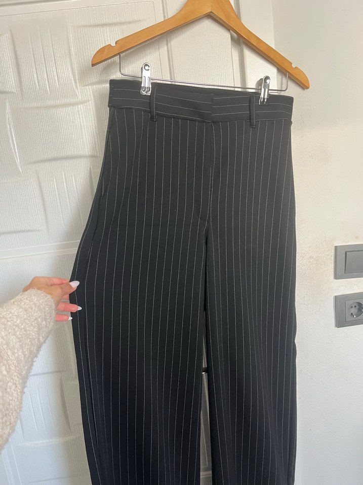Kadınlar için gri renkli, pilili ve çizgili desenli kumaş pantolon. Normal boy ve regular fit, ofis ile günlük sokak stiline uygundur.