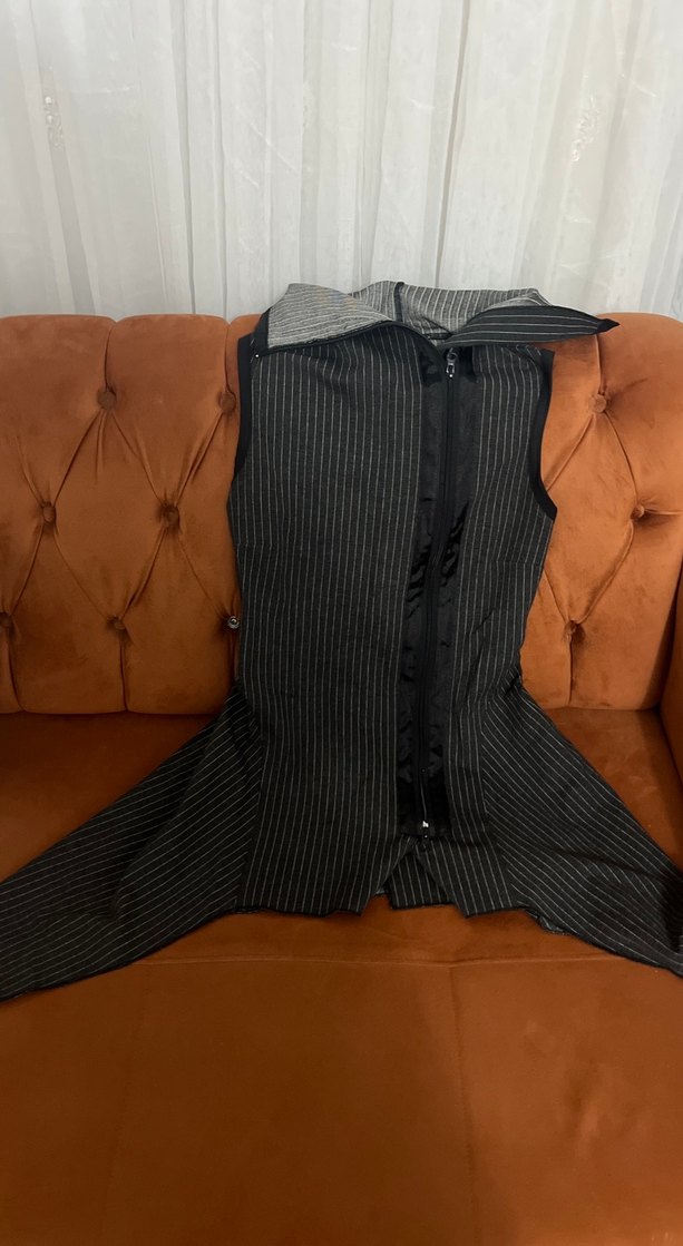 Kadınlar için sentetik kumaştan yapılmış, fermuarlı ve çıtçıtlı uzun kesim, çizgili gri renkli kolsuz blazer.