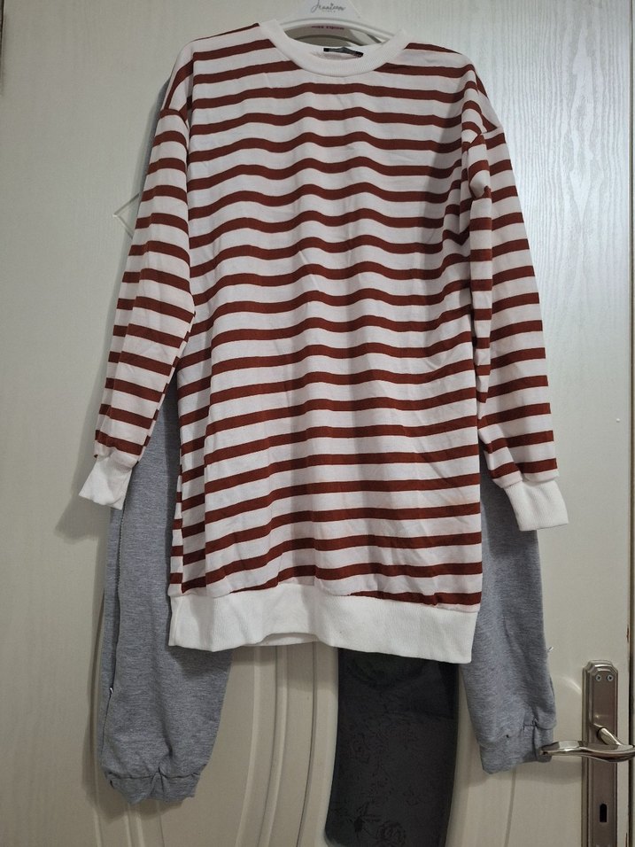 Kadın pijama takımı, uzun kollu ve yuvarlak yakalı salaş üstü ile gri alt pantolonlardan oluşur. Rahat ve günlük tarzda çizgili üst kısmı vardır. TAKIMIDIR