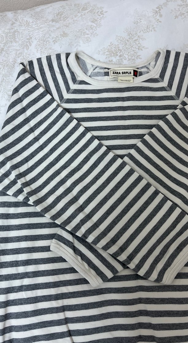 Pamuklu, gri çizgili uzun kollu, yuvarlak yakalı, bol kesim kadın tişörtü. Günlük rahat kullanım için uygundur.