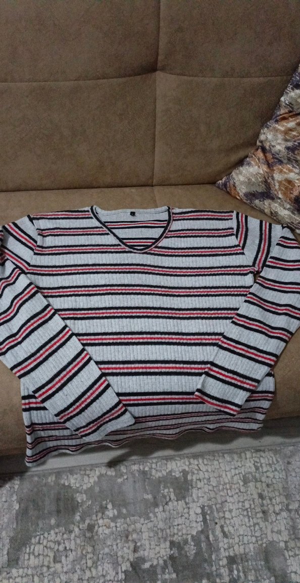 Kadınlar için uzun kollu, yuvarlak yakalı, bol kesim gri tonlarda çizgili triko kazak. Rahat ve yumuşak dokuludur.
