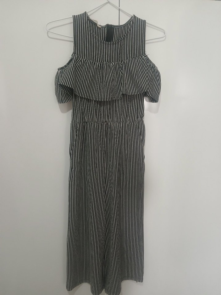 Kadınlar için gri çizgili, pileli ve askısız yakalı uzun tulum. Sentetik kumaştan, regular fit ve askılı kollu, günlük sokak stili için uygun.