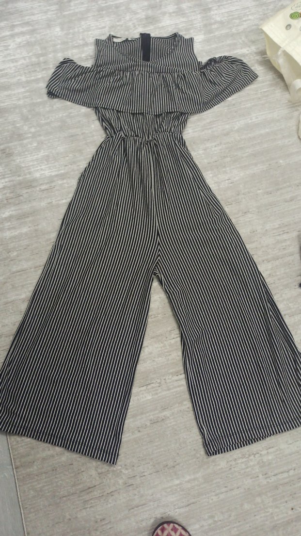 Gri çizgili, tekne yaka ve askılı kollu uzun tulum. Pilili tasarımı ve rahat kesimiyle günlük sokak stiline uygundur. paçası kapri