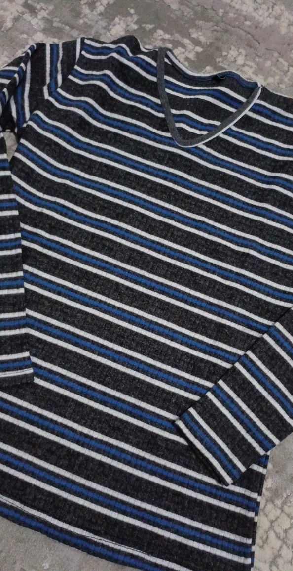 Gri ve mavi tonlarında çizgili, v yakalı, fit kesim kadin kazak Normal midi uzunlukta ve günlük bir tarza sahip.