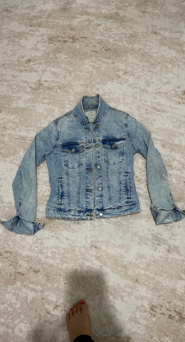 Uzun kollu, yaka detaylı, gri renkli, yıkama desenli, normal kısalıkta kadınlara özel, dar kesim denim ceket.