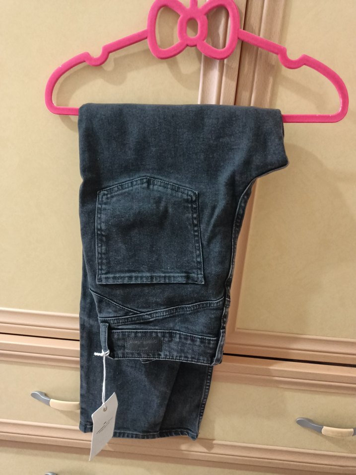 Kadınlar için gri denimden yapılmış, dar paça ve normal boyda jean. Tokalı detaylı ve sokak stili, günlük kullanım için uygundur. Hiç kullanılmadı, etiketli ürün.