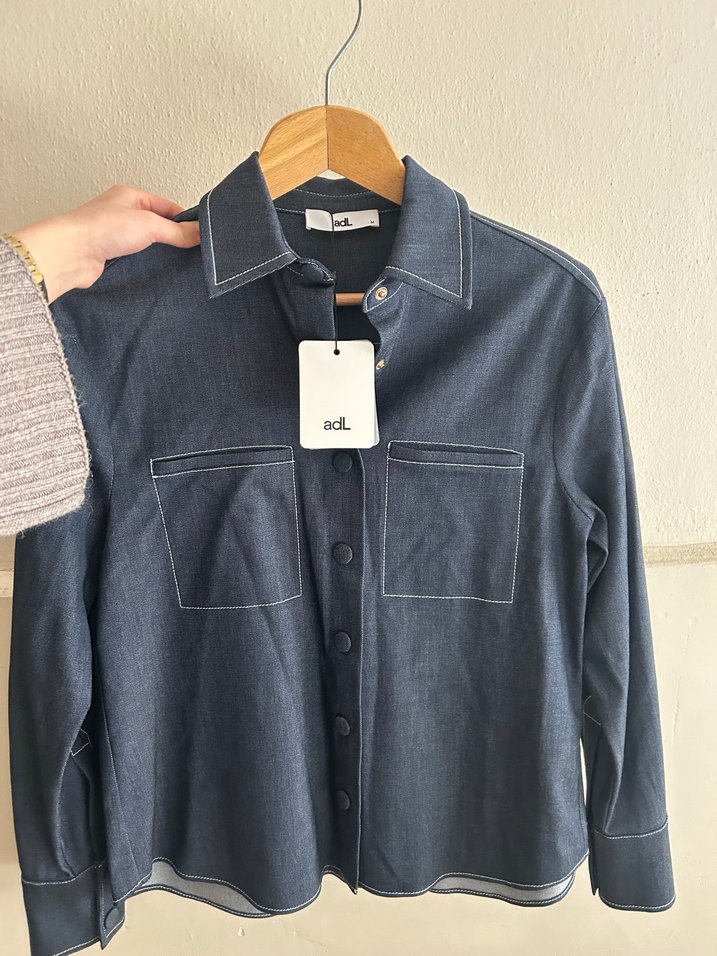 adL markalı gri denim kadın gömleği, yakalı ve düğmeli ön tasarıma sahiptir. Uzun kollu, bol kesim ve iki cep ile günlük kullanıma uygundur.