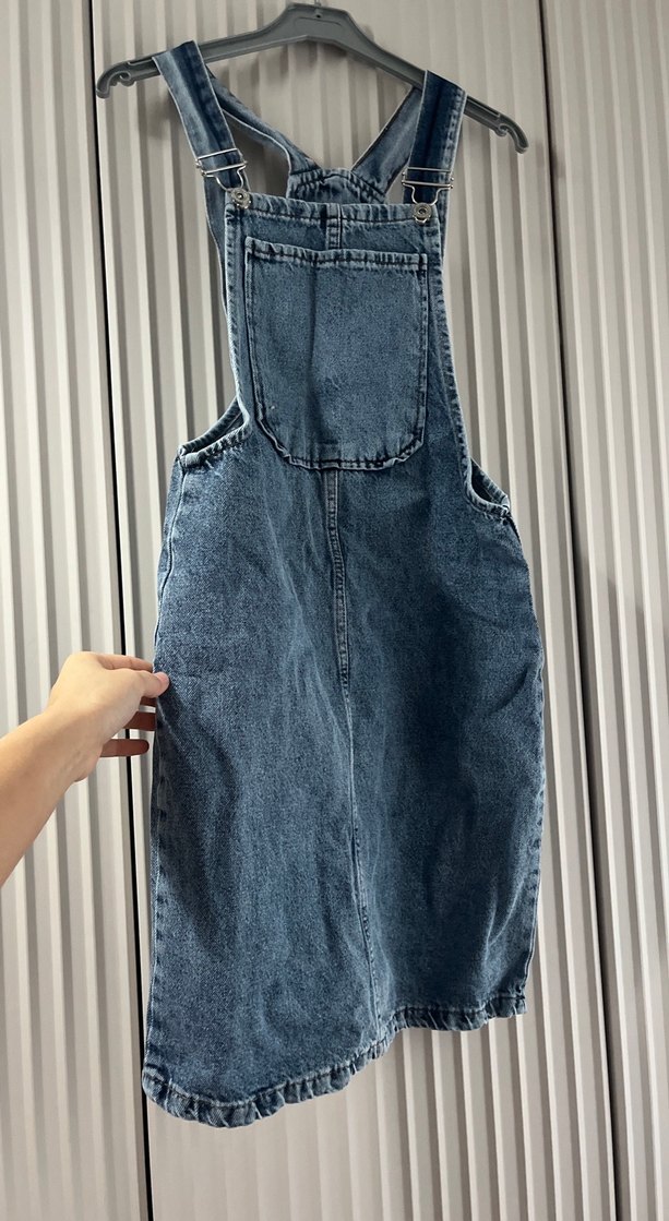 Bu kadınlar için gri-mavi denim midi uzunlukta, askılı ve tokalı tulum, günlük kullanıma uygun, sade ve şık bir sokak giyimi parçasıdır.
