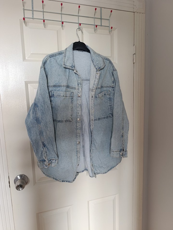 Bu kadın denim ceketi, bol kesim, uzun kollu ve kesik yaka detaylarına sahiptir. Düğmeli önü ve gri-mavi tonuyla günlük sokak stiline uygundur. küçük beden fakat 40 bedene kadar uygundur geniş kalıp