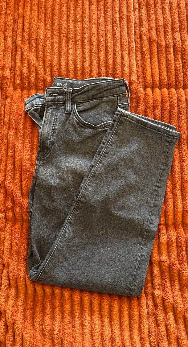 Gri denimden yapılmış, normal boy ve regular fit kadın kot pantolon. Tokalı detayı ve desen içermeyen sade tasarımıyla günlük kullanıma uygun.