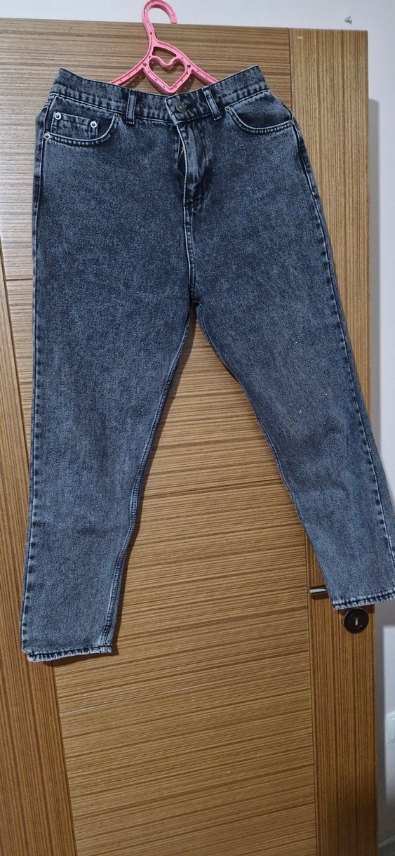 Kadınlar için dayanıklı denimden yapılmış, regular fit ve normal boyda gri renkte jean. Tokalı detaylara sahip, günlük sokak tarzına uygun.
