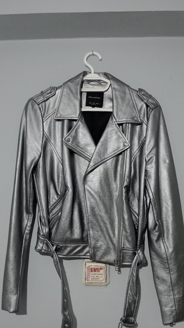Gri deri biker ceket, kesik yakalı, tokalı detaylara sahip. Normal uzunlukta, strappy kollu, günlük kullanıma uygun sokak stilinde şık bir parça.