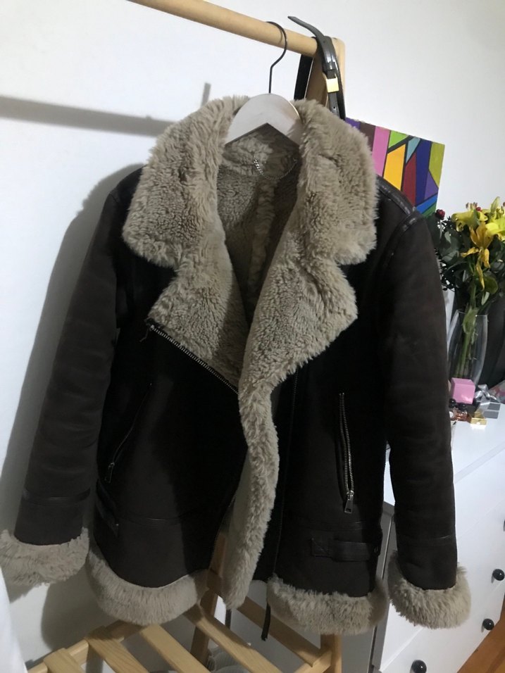 Bu kadın deri ceket, rahat kürk detayları ve kesik yaka ile gri renkte, günlük kullanım için uygun sokak stili sunar.