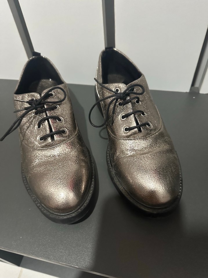 Kadınlar için gri metalik deri oxford laofer , ben uzun bilekte çoraplar yada desenli kilotlu çoraplar ile giymek için aldım 2 kez giydim desensiz tasarıma sahip parlak ve bağcıklıdır. 38 no fakat 37 no giyen için uygun hiçbir kusuru yok stradivirus marka
