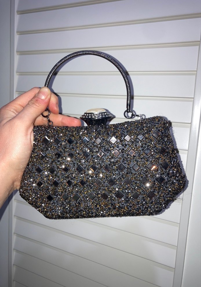 Kadın gri renkli, desenli ve payetli portföy çanta. Sentetik kumaştan, çağdaş tarzda, küçük saplı, romantik akşamlar için uygun. ✨bir kez cok özel bi gecede kullandim sorunsuz ve kusursuz güzellikte….