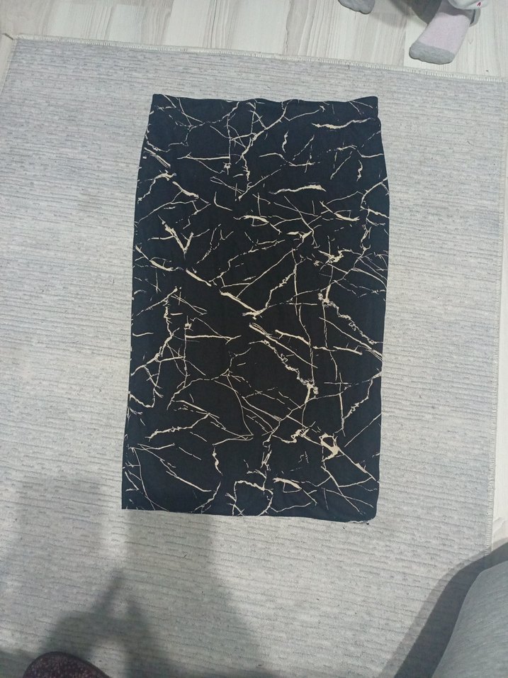 Kadınlar için siyah zemin üzerine baskılı desenli, elastik bel ve regular fit kalem etek. Uzun boy ve çağdaş sokak stilinde, dış mekan kullanımı için uygundur. ✨hiç kullanilmadi