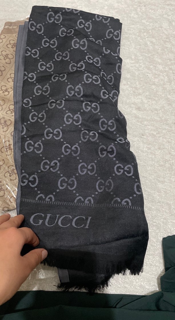 Kadınlar için drapeli gri sentetik kumaş şal, Gucci logosu deseniyle. Rahat ve trend sokak stili.