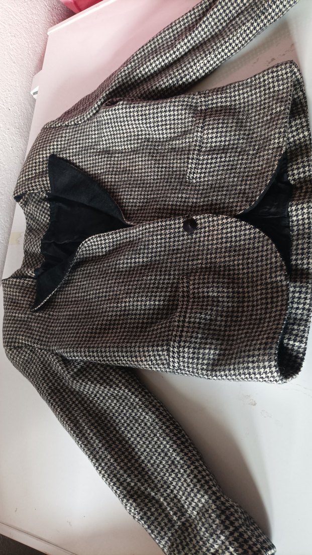 Kadın blazer, düğmeli ve kesik yakalı, sentetik kumaştan gri kazayağı desenli. Uzun kollu, midi boy ve normal kesim, ofis için uygun.