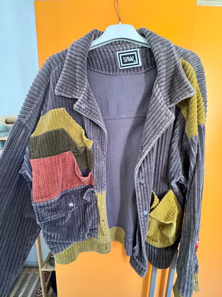 Kadınlar için düğmeli, bol kesim ve uzun kollu gri ceket. Kısa boylu, çok renkli tie-dye desenli ve notched lapel yaka detaylı. Günlük kullanıma uygun street style ürünü.