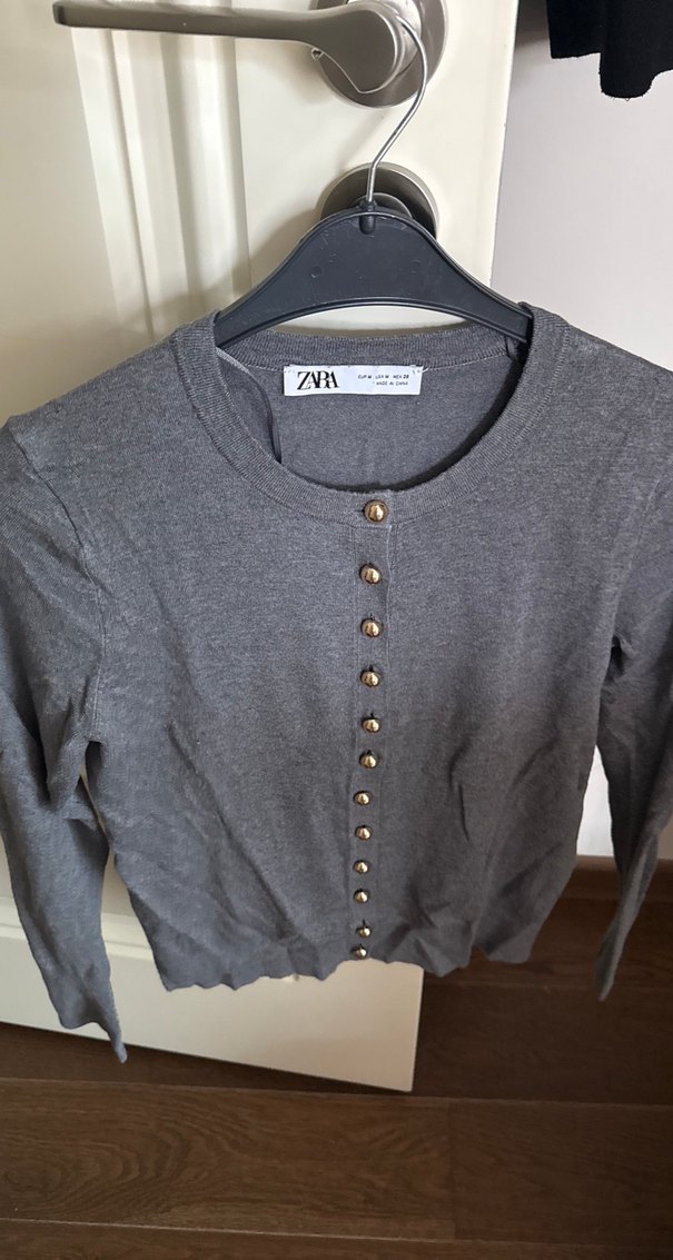 Gri renkli, düğmeli, uzun kollu ve yuvarlak yakalı pamuklu kadın hırka. Vücuda oturan kesimiyle günlük kullanıma uygun rahat bir modeldir. Zara