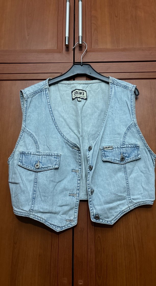 Düğmeli ve kolsuz kadın kot yelek, gri renkte, notched yaka ve rahat kesimlidir. Günlük sokak tarzına uygun midi uzunluktadır. Beden l fakat kalıbı küçük