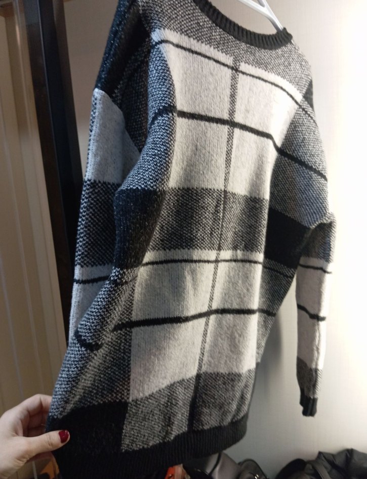 Örgü yün kumaştan, uzun kollu, yuvarlak yaka gri ekose desenli kazak. Günlük rahat sokak stiline uygundur. Temizdir