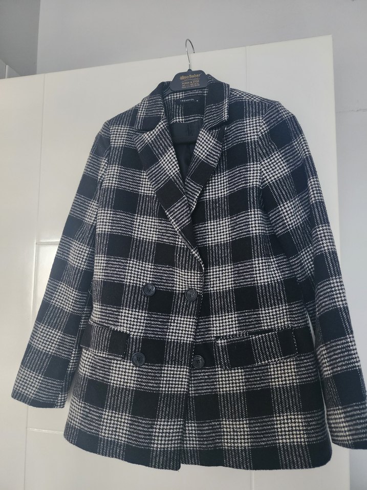 Kadınlar için notalı yakalı, düğmeli ve regular fit kesime sahip gri ekose desenli blazer ceket. Sentetik kumaştan, uzun kollu ve ofis kullanımı için uygun.