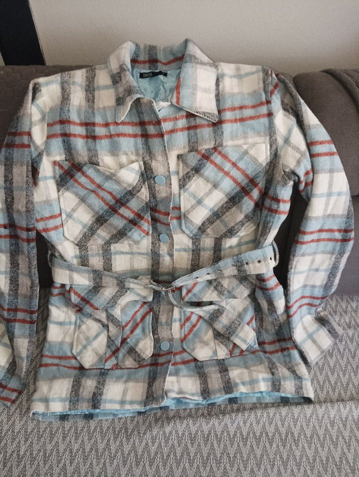 Kadın gri ekose desenli gömlek, uzun kollu ve kemerli bel detayına sahiptir. Düğmeli, rahat kesim ve yumuşak kumaştan yapılmıştır, günlük kullanıma uygundur.