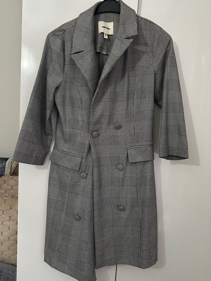 Kadınlar için gri ekose desenli, düğmeli uzun ceket. Notlu yaka ve uzun kollu, rahat bir kesime sahiptir. Ofis ve günlük kullanıma uygundur.
