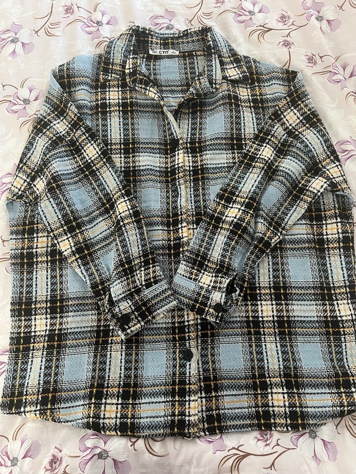 Gri çok renkli ekose desenli, düğmeli, uzun kollu, notalı yaka detaylı, bol kesim ve normal boyda kadın gömleği. Yumuşak tekstil kumaştan, günlük rahat kullanım için uygundur.