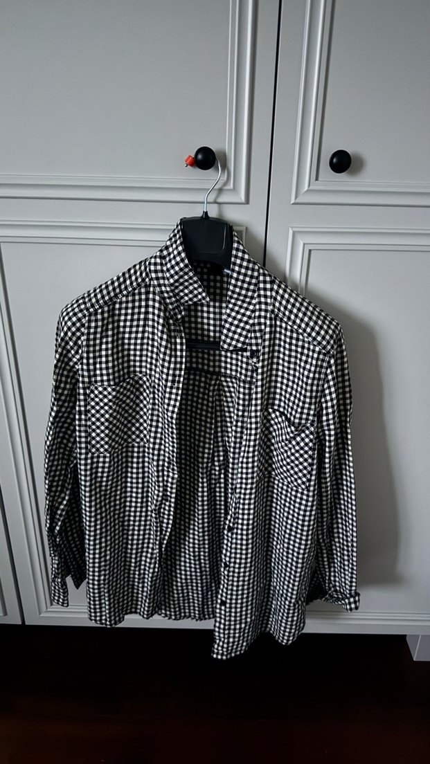 Düğmeli, uzun kollu ve notlu yakalı kadın gömleği. Gri ekose deseni ve rahat dokuma kumaşı ile günlük kullanım için uygundur.