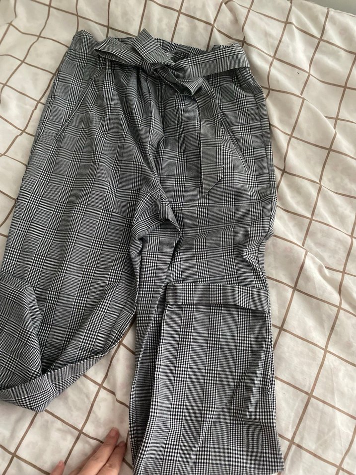 Kadınlar için kemerli, gri ekose desenli, midi boy, regular fit kumaş pantolon. Yumuşak sentetik kumaştan üretilmiş, rahat ve şık bir sokak stili parçası.