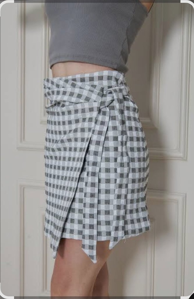 Kadınlar için gri ekose desenli, kemerli ve bol kesim sentetik kumaştan mini etek. Günlük ve sokak stiline uygun.