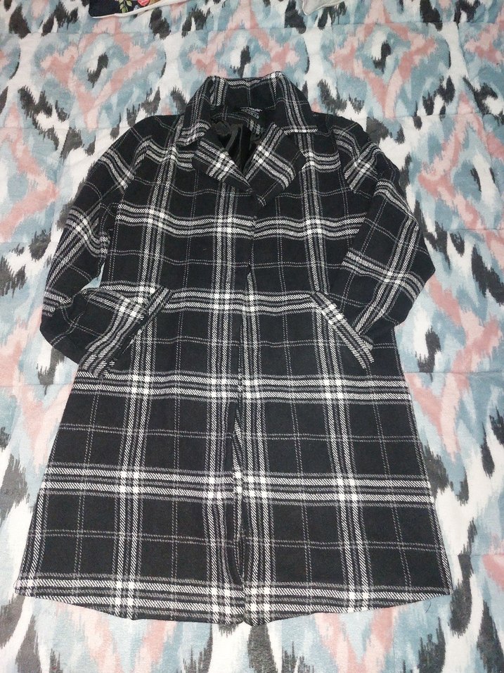 Kadınlar için uzun, bol kesim gri ekose desenli kaban. Uzun kollu, düğmeli ve koyu renklerde, rahat sentetik kumaştan, günlük sokak stili için uygun.
