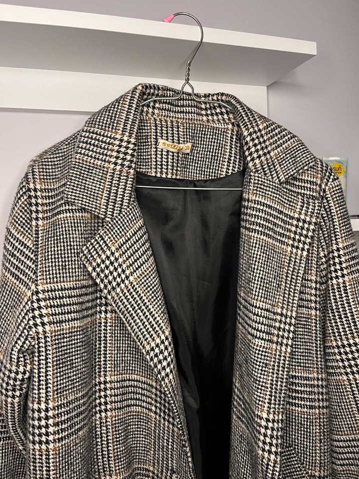Kadınlar için notlu yaka ve düğmeli ön detaylı, sentetik kumaştan yapılmış koyu gri ekose desene sahip uzun kaban. Uzun kollu ve regular fit, günlük kullanıma uygun trend bir tarz sunar.
