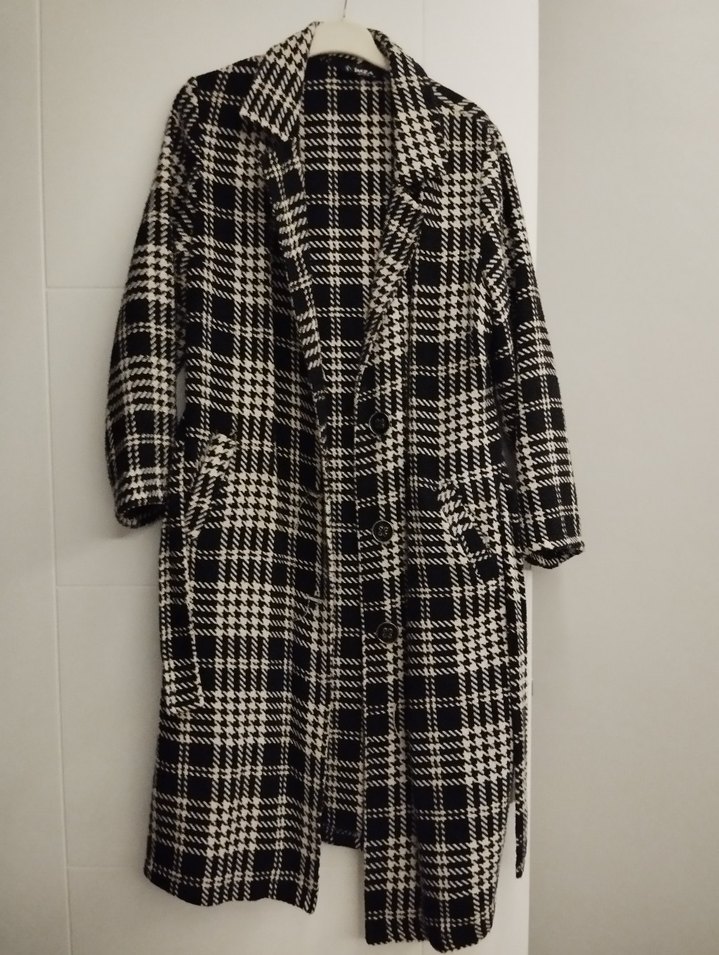 Kadınlar için gri ekose desenli, uzun kollu, düğmeli ve normal kesim kaban. Sentetik kumaştan rahat ve sokak stiline uygun, günlük kullanım için ideal.