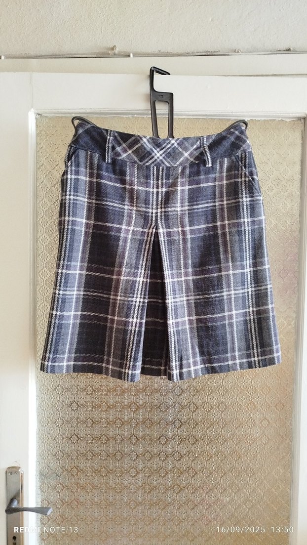 Kadın gri ekoseli, pilili ve regular fit kesime sahip sentetik kumaştan yapılmış etek. Trendy casual sokak stili için uygundur. bel 44 cm boy 56 cm